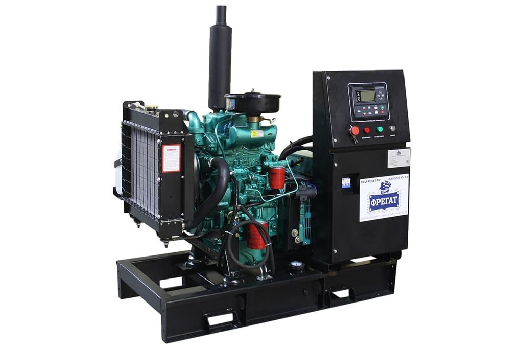 Электроагрегат установлен на прочной раме, включающей в себя топливный бак объемом 808 литров. Здесь же смонтирован пульт управления DSE 6120, оснащенный дисплеем, на котором отображаются ключевые параметры работы и текущее состояние дизельной электростанции. Панель управления включает кнопки для аварийной остановки, ручного запуска, переключения в бесшумный режим и активации автоматического режима работы. В стандартный комплект поставки Фрегат АД-60 входят аккумуляторная батарея и глушитель шума.